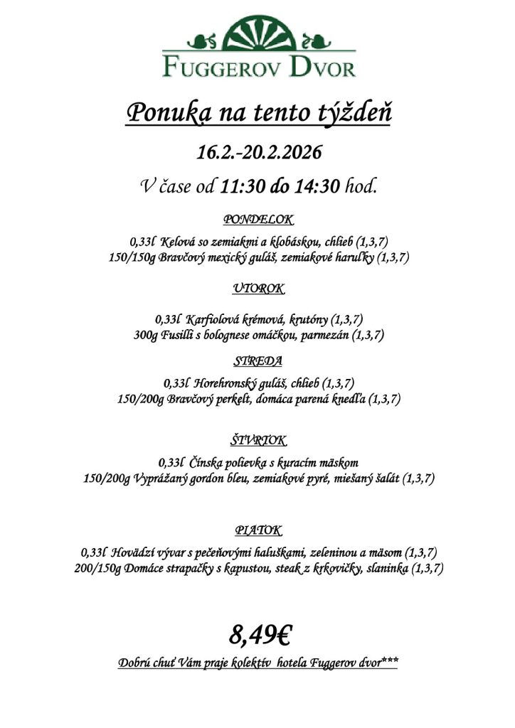 Denné menu 16.2.-20.2.2026 Nezaradené, Oznamy 16. februára 2026 / Komentáre vypnuté na Denné menu 16.2.-20.2.2026